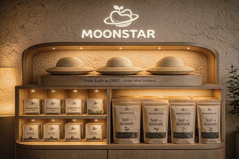 Aber MOONSTAR geht weiter. Es denkt den Raum. Die Theke ist kein Verkaufsort, sondern eine pädagogische Installation. Kinder sehen, wie Erde funktioniert. Erwachsene begreifen, wie Ernährung zirkulär gedacht wird. In kleinen Seed-Kits, verpackt in kompostierbare Zellstoffwürfel, kann jeder seine eigene Mini-Bohnenstation mitnehmen als Geschenk, als Statement, als Einstieg in ein anderes Konsumverhalten. Und weil wir wissen, dass Nachhaltigkeit ohne Design nur ein weiterer Zwangsjacken-Begriff ist, wurde jedes Detail mit ästhetischem Anspruch gestaltet: von der Orbit-Hut-Verpackung für Pflanz-Sets bis zu den runden Paprika-Saucencontainern im leuchtenden Chilirot.