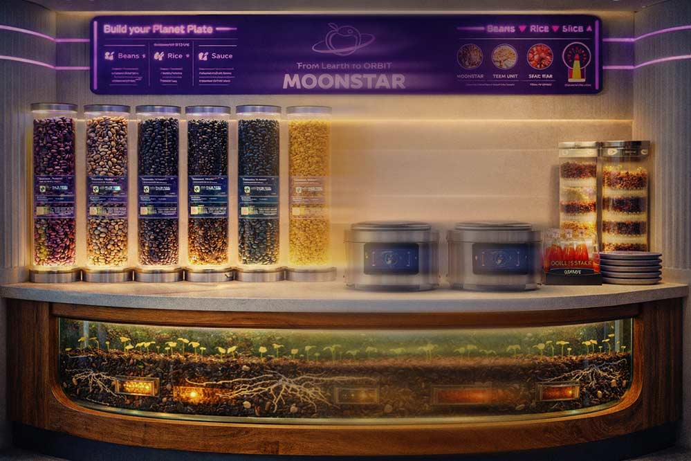 Willkommen in der Dampfarena. Wir initiieren Nährstoffsysteme. In 20 Jahren besitzen Haushalte keine Küchen mehr, sondern modulare Food-Units. Die Geräte sind kleiner als heutige Mikrowellen, funktionieren mit Dampf statt Strahlung und docken sich an Bohnenkartuschen und Reiscontainer an. Die Benutzeroberfläche ist intuitiv, die Gerichte variieren nach Tagesform und Nährstoffbedarf. MOONSTAR denkt diesen Wandel nicht nur mit es prägt ihn. Die Filialen sind keine Läden, sondern Mini-Orbit-Terminals für bewusste Esser mit Sinn für Stil und Struktur.