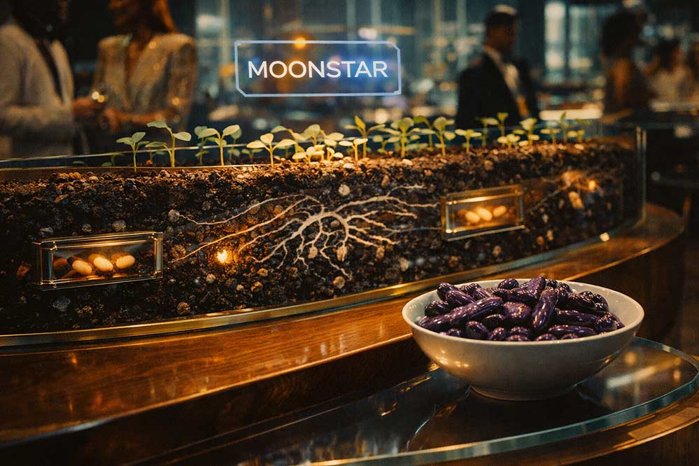 Das größte Risiko nachhaltiger Foodkonzepte liegt nicht in der Produktion, sondern in der Präsentation. Gemüse hat PR-Probleme. Wenn ein Kohlkopf aussieht wie eine alte Glühbirne in Rente, wird er nicht gekauft egal wie nährstoffreich er ist. MOONSTAR löst dieses Problem durch Design: Die Bohnen dampfen im futuristischen Glasdom, die Aubergine glänzt wie ein Space Shuttle im Ruhestand. Die Ästhetik transformiert das Alltägliche ins Begehrenswerte. Und das ist nicht nur schön, sondern notwendig.